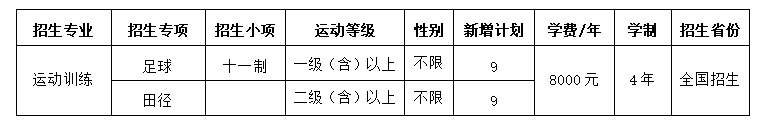 为响应国家体育强国战略,培养更多优秀体育人才,不断加强我校足球、田径等项目建设发展,经请示国家体育总局同意,我校决定增加2022年运动训练专业招生计划18人。具体增加计划情况公布如下: