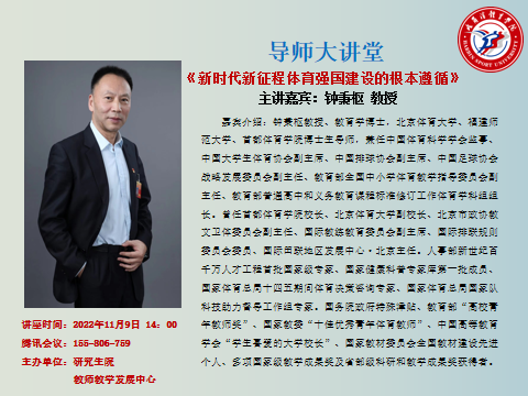 2022年11月9日下午2:00,研究生导师大讲堂于尚德楼学术报告厅举行,本期导师大讲堂的邀请的嘉宾是钟秉枢教授。哈尔滨体育学院党委副书记、校长陈德明主持讲座,研究生院院长杜春华、人事处处长张显峰、教师发展中心副主任张彦秋、研究生院副院长李晓琳参加讲座。讲座采用线下与线上相结合的方式展开,参会人员为哈体博士生导师、硕士生导师和2022级全体博士、硕士研究生。