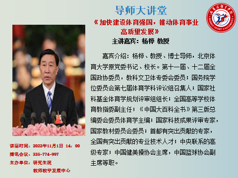 2022年11月1日下午2:00,研究生导师大讲堂于尚德楼学术报告厅举行,本期导师大讲堂邀请的嘉宾是北京体育大学原党委书记、校长杨桦教授。哈尔滨体育学院党委副书记、校长陈德明主持讲座,哈尔滨体育学院党委副书记姜玉洪、研究生院院长杜春华、人事处处长张显峰、教师教学发展中心副主任张彦秋、研究生院副院长李晓琳参加讲座。讲座采用线下与线上相结合的方式展开,参会人员为哈体博士生导师、硕士生导师和2022级全体博士、硕士研究生。