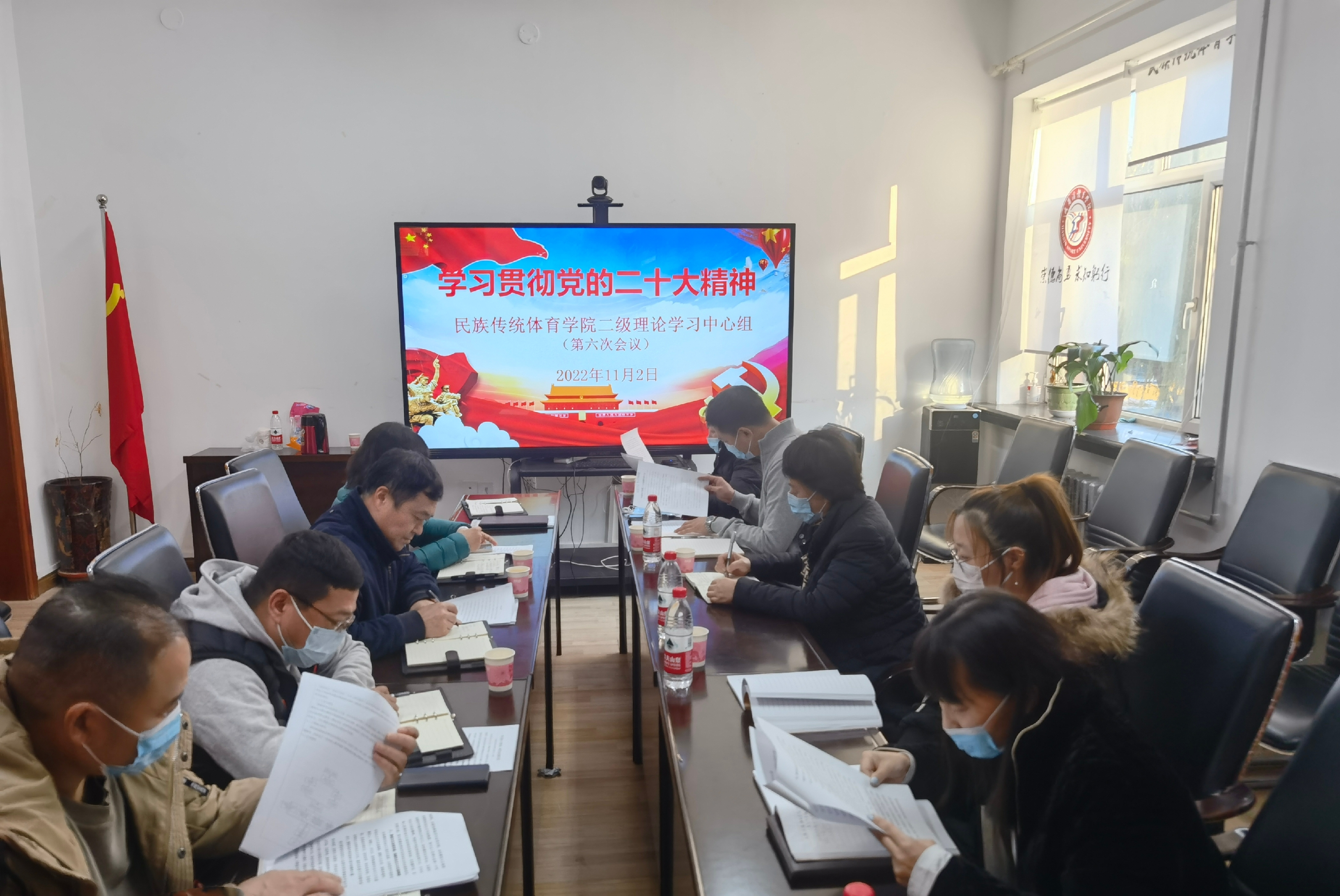 11月2日下午,民族传统体育学院在二级理论学习中心组第六次会议上专题学习贯彻党的二十大精神。民族传统体育学院党总支书记吕吉勇主持会议,院长杨慧馨、党总支副书记周滨、副院长李世宏出席会议,民族传统体育学院学生办公室主任张大德、组织员刘冬梅、教师党支部书记李丽、副书记许艳列席会议。宣传统战部全体人员旁听会议。