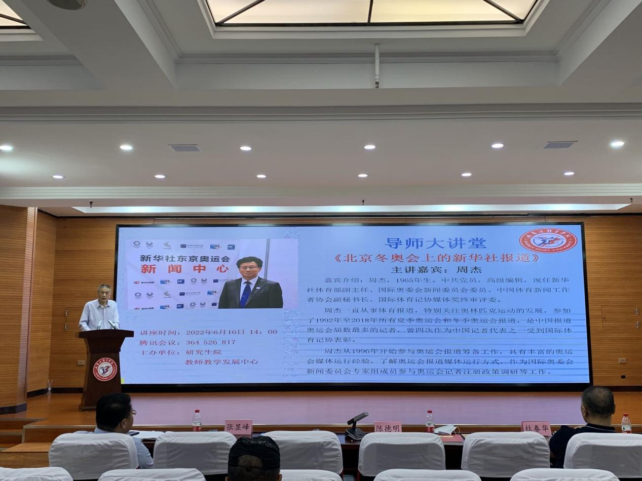 2022年5月16日14:00,新华社体育部周杰副主任受邀为我校师生带来研究生导师大讲堂系列讲座第十五讲——《新华社与北京冬奥会报道》。哈尔滨体育学院党委副书记、校长陈德明主持讲座,研究生院院长杜春华、人事处处长张显峰、教师发展中心副主任张彦秋、研究生院副院长李晓琳参加讲座。讲座采用线上线下相结合的形式展开,线上参会人数达500余人,受到我校广大硕、博导师及研究生的热烈欢迎。