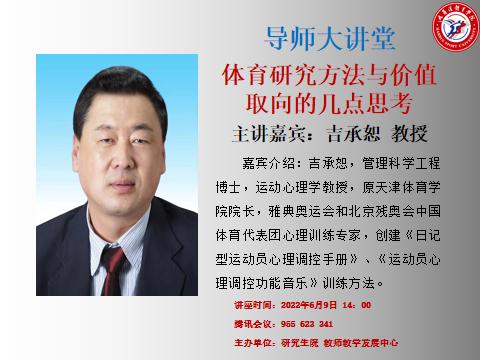 2022年6月9日14:00,我校研究生院导师大讲堂在尚德楼三楼学术报告厅举行,讲座邀请吉承恕教授作《体育研究方法与价值取向的几点思考》专题讲座。讲座采用线上与线下结合的方式进行。
