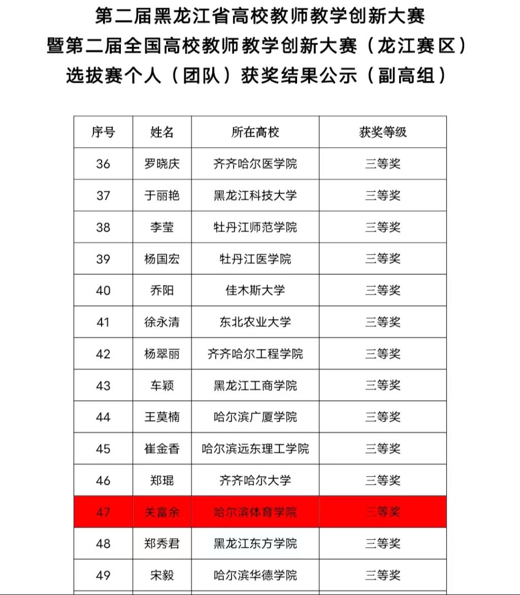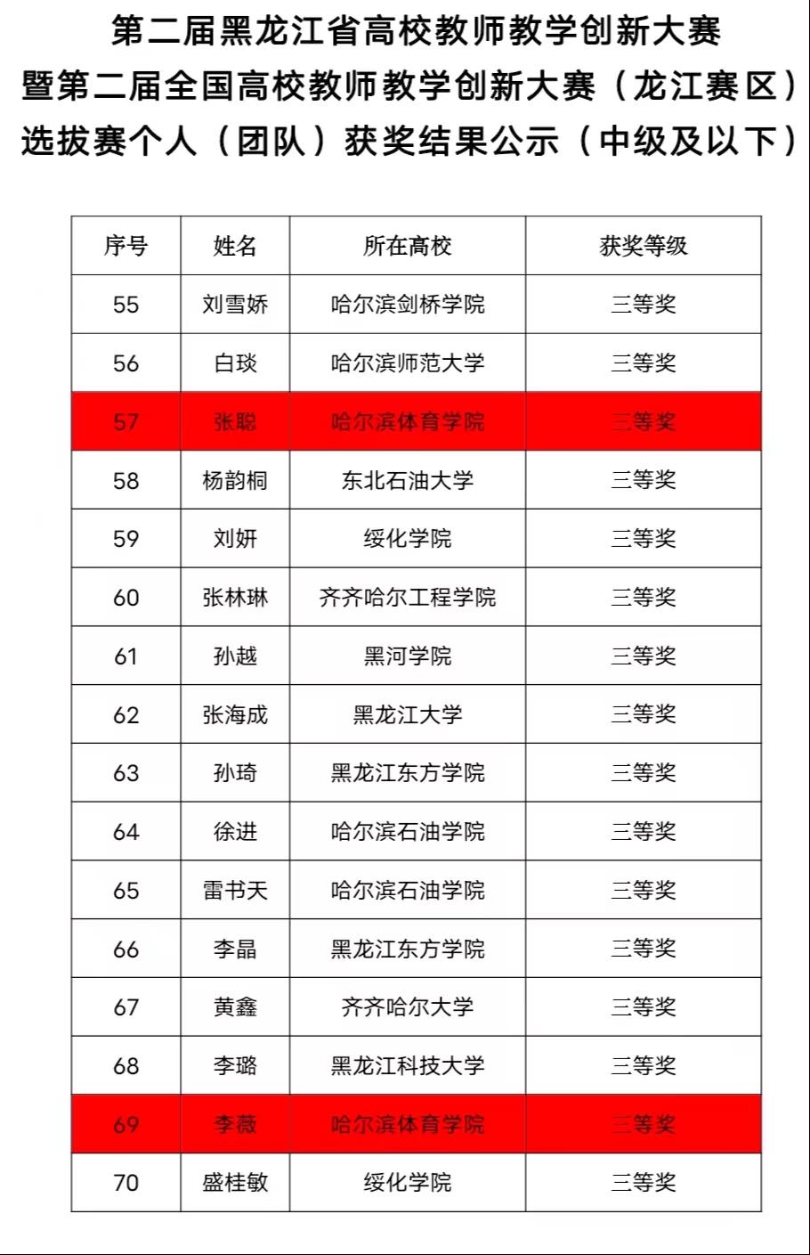 2021年11月,由黑龙江省教育厅主办的第二届黑龙江省高校教师教学创新大赛暨第二届全国高校教师教学创新大赛(龙江赛区)选拔赛拉开帷幕,根据《黑龙江省教育厅关于举办第二届黑龙江省高校教师教学创新大赛暨第二届全国高校教师教学创新大赛(龙江赛区)选拔赛的通知》要求,全省所有高校共443位教师参加,经过网络评审和现场评审两个比赛环节,2022年5月8日第二届黑龙江省高校教师教学创新大赛圆满落幕,我校继第一届黑龙江省教师教学创新大赛获得两项三等奖后今年又添佳绩,我校王安洪教师团队获正高组三等奖,关富余教师团队获副高组三等奖,张聪教师团队、李薇教师个人获中级及以下组三等奖。