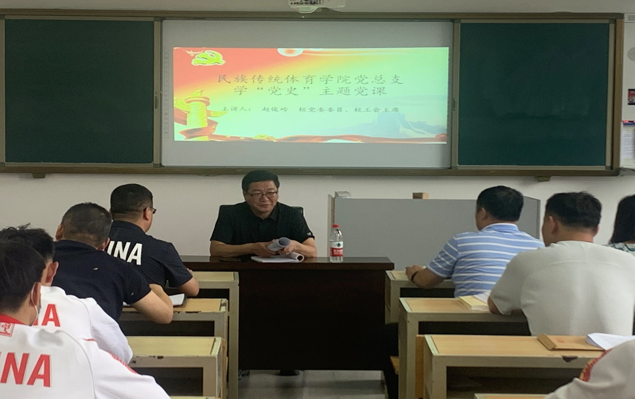 6月9日下午,我校党委委员、工会主席赵俊岭到民族传统体育学院开展“中国共产党百年辉煌”讲党课活动。学院党总支书记呂吉勇、院长杨慧馨、副院长周滨以及全体师生党员参加了党课学习。开课仪式由学院党总支书记呂吉勇主持。