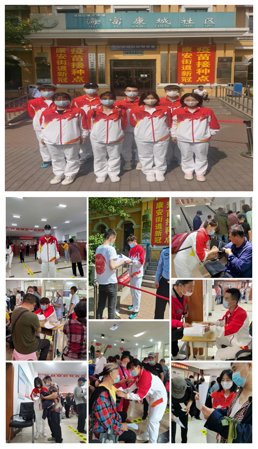 为落实疫情防控政策,保障市民群众身体健康,助推新冠病毒疫苗接种工作,体育教育训练学院党总支根据“保障到位,组织有序”的总体原则,选派学生第三党支部“天空致爱”志愿者服务队协助道里区康安街道办事处开展疫苗接种维护管理工作。 面对数量庞大的接种人群,保障接种区域防疫安全工作显得尤为重要,工作人员在听取学生建议后将接种现场划为多个区域,志愿者积极对群众进行引导,细心解答群众有关疫苗接种的各种疑问,使整个疫苗接种环节井然有序。 党员们表示:作为新时代的青年,参与到项为民服务的事业中感到无比光荣,这也和学校开展的党史学习教育紧密相关,正如习近平主席在中国共产党第十九次全国代表大会上指出“青年兴则国家兴,青年强则国家强,青年一代有理想、有本领、有担当,国家就有前途,民族就有希望”。