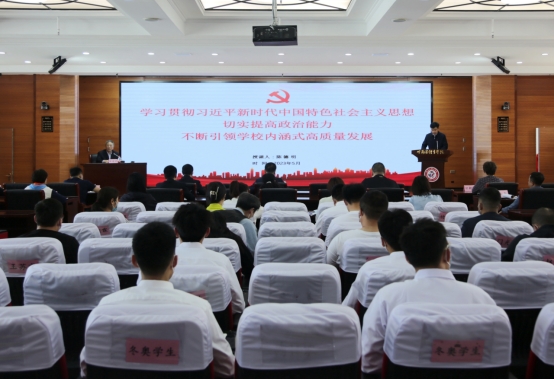 为扎实开展学习贯彻习近平新时代中国特色社会主义思想主题教育,根据学校主题教育安排,5月23日,学校党委副书记、校长陈德明以《学习贯彻习近平新时代中国特色社会主义思想 切实提高政治能力 不断引领学校内涵式高质量发展》为题讲授专题党课。省委主题教育第十六巡回指导组副组长李云峰、成员周长群,学校审计处、人事处、财务处、国际交流合作处全体同志、冬季奥林匹克学院全体教师和学生党员参加了学习活动。专题党课由学校党委委员、组织部部长王广贵主持。