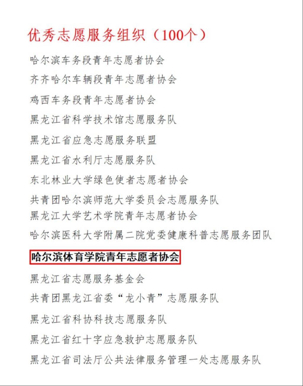 近日,黑龙江省文明办发布了2023年度全省志愿服务“五个100”先进典型名单的通报,学校青年志愿者协会成功入选,获评2023年度全省优秀志愿服务组织。