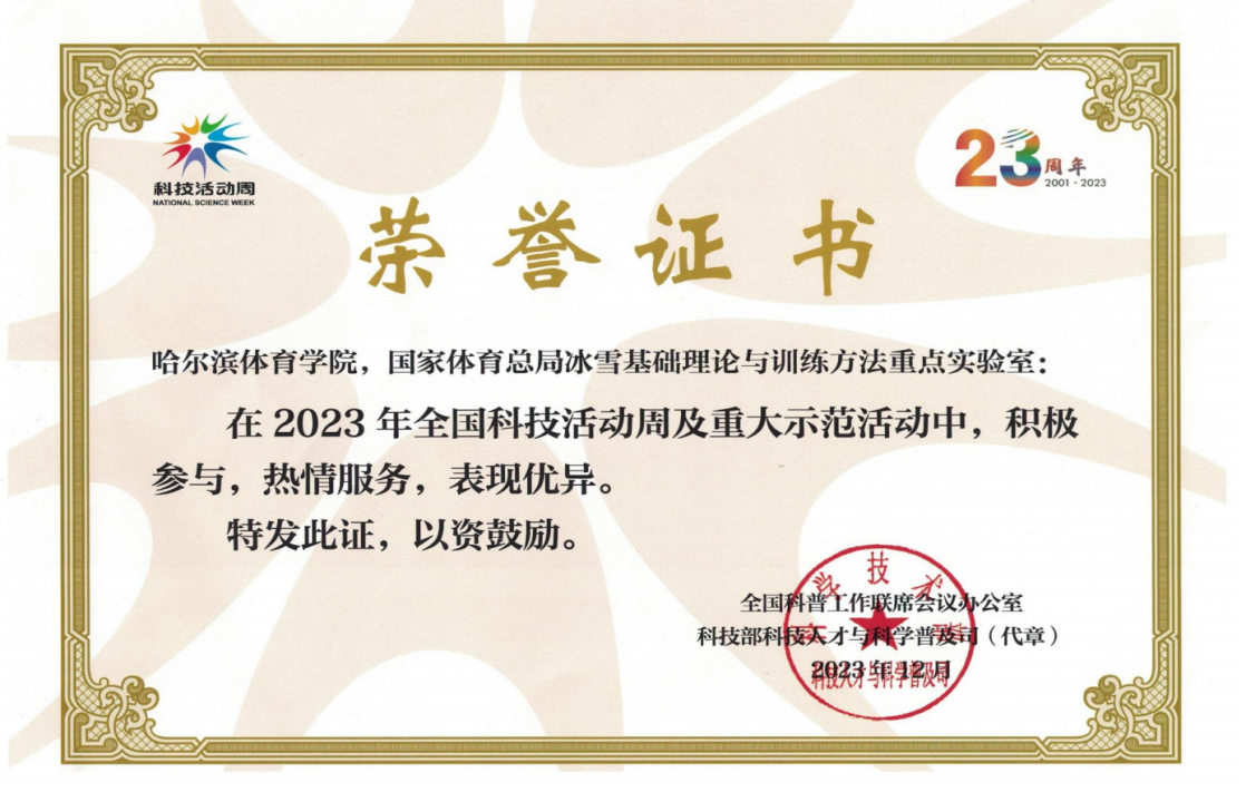 根据科技部、中央宣传部、中国科协《关于举办2023年全国科技活动周的通知》(国科函才〔2023〕65号)、全国科普工作联席会议办公室《关于推荐2023年全国科技活动周表现突出参与单位和人员的通知》(科普联办〔2023〕5号),经国家体育总局科教司推荐,并报全国科普工作联席会议办公室、科技部人才与科普司批准,哈尔滨体育学院国家体育总局冰雪运动基础理论与训练方法重点实验室荣获2023年全国科技活动周先进集体。