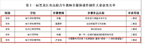 近日,第十一届黑龙江省高校微课教学比赛和高校青年教师多媒体课件制作比赛圆满落幕。我校荣获一等奖两项、二等奖三项及优秀组织奖共六项。其中,体育教育训练学院教师王砚镭、马克思主义学院教师刘琳琳分别获第十一届黑龙江省高校微课教学比赛一等奖、二等奖;马克思主义学院教师宋磊获第十一届黑龙江省高校青年教师多媒体课件制作大赛一等奖,体育教育训练学院教师高晨辰、体育艺术学院教师卢佳怡获第十一届黑龙江省高校青年教师多媒体课件制作大赛二等奖,同时学校获得了第十一届黑龙江省高校青年教师多媒体课件制作比赛优秀组织奖。