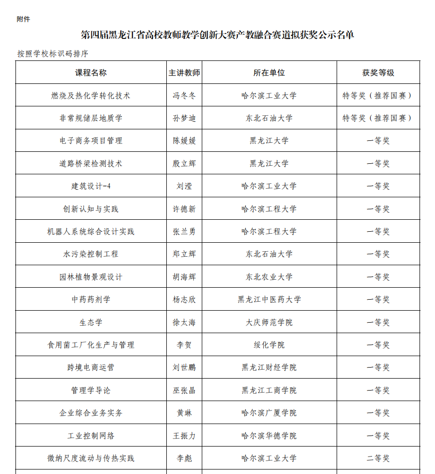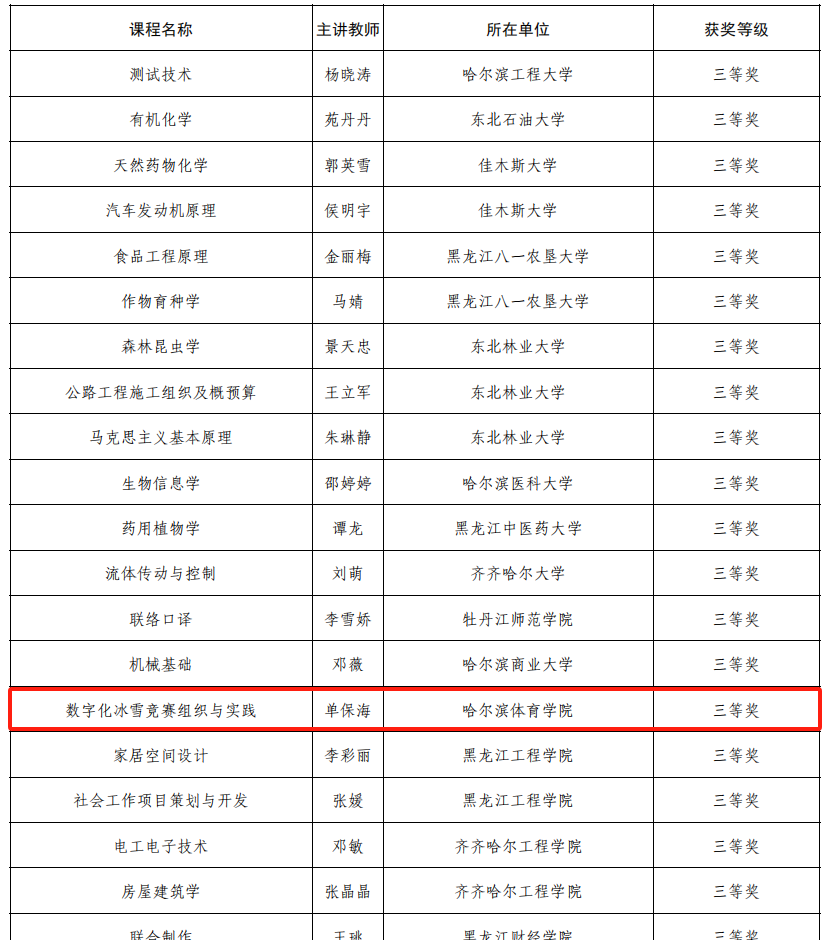 近日,第四届全国高等学校教师教学创新大赛产教融合赛道黑龙江赛区获奖名单公布。我校首次组织教师参赛并在比赛中喜获佳绩,我校体育科学研究院单保海教师团队荣获三等奖。