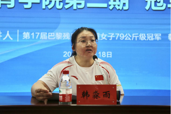 韩淼雨在宣讲中讲述了自己自幼意外烧伤失去左小腿和右手小指,但积极乐观、自强不息,师从我校那宪飞老师,成为了黑龙江省残疾人运动队的运动员,在日复一日的艰苦训练下,一次次站上世界大赛领奖台的感人经历。