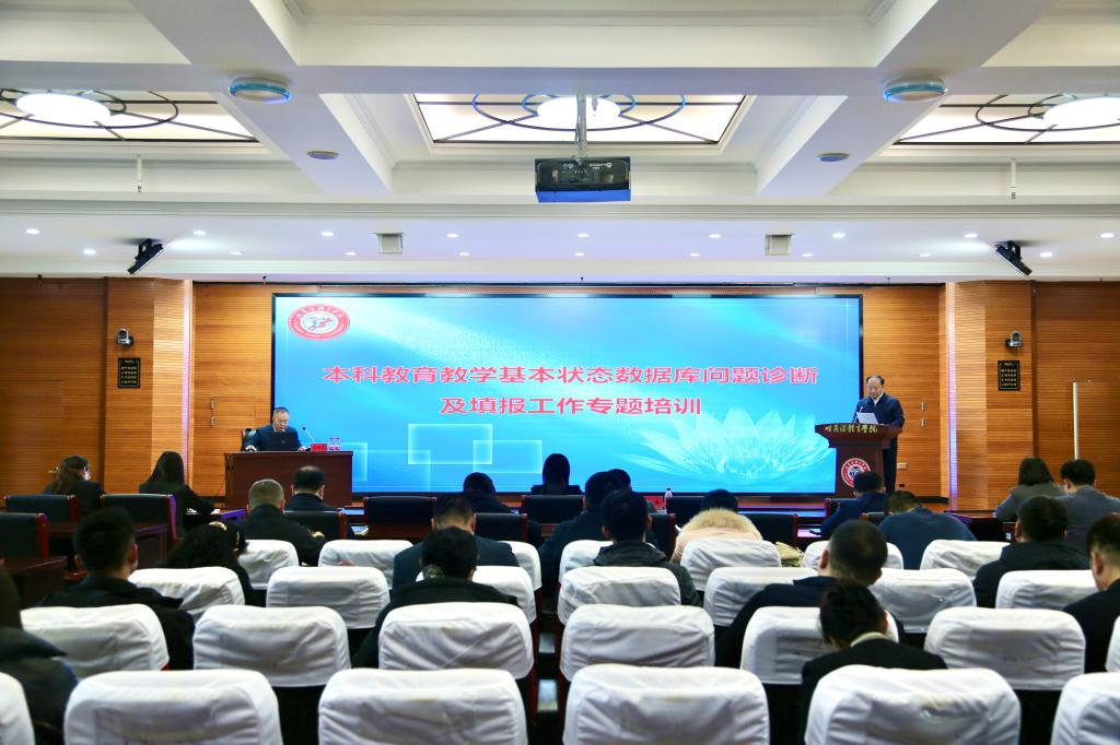 校长姜玉洪主持培训,副校长齐景嘉、相关职能部门、各二级学院、马克思主义学院党政负责人及数据填报人员、教务处和高教研究与评估中心全体工作人员参加本次培训。