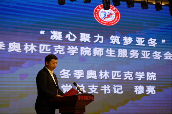 冬奥学院党总支书记穆亮发表了热情洋溢的致辞,强调了“亚冬会”作为国家重大体育赛事的特殊意义,对学院师生在志愿服务工作中的积极参与给予了充分肯定和鼓励,并希望大家牢记责任使命,努力学习奋进,发挥团结协作精神,展现出哈体冬奥人的精神风貌,彰显哈体院的水准与担当。