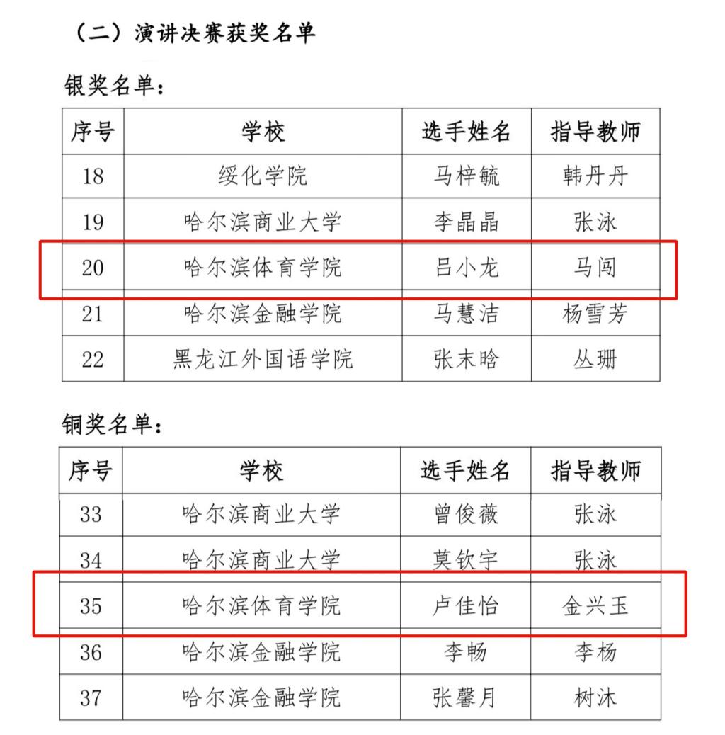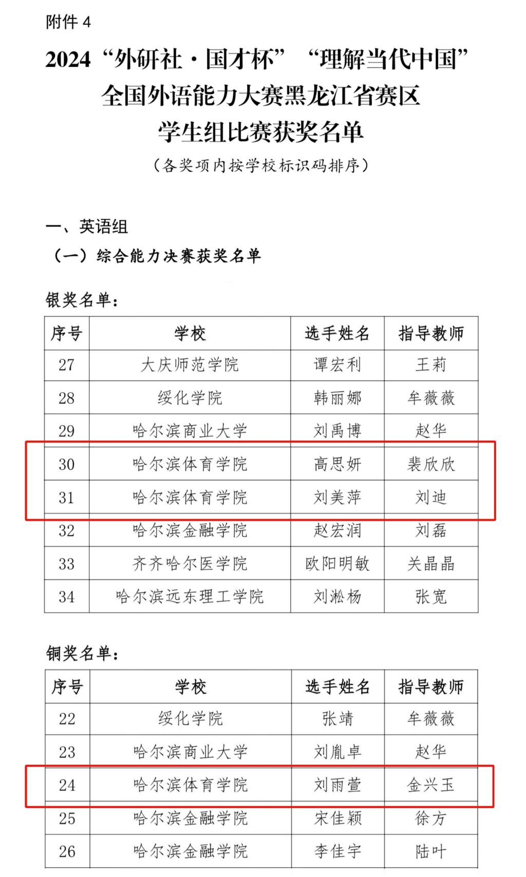 近日,黑龙江省委宣传部、省教育厅联合公布2024“外研社·国才杯”“理解当代中国”全国外语能力大赛黑龙江省赛区国赛和省赛获奖名单。我校共有6名同学获英语组奖项,其中,综合能力决赛银奖2人,铜奖1人;演讲决赛银奖1人,铜奖1人;英语组笔译决赛铜奖1人。