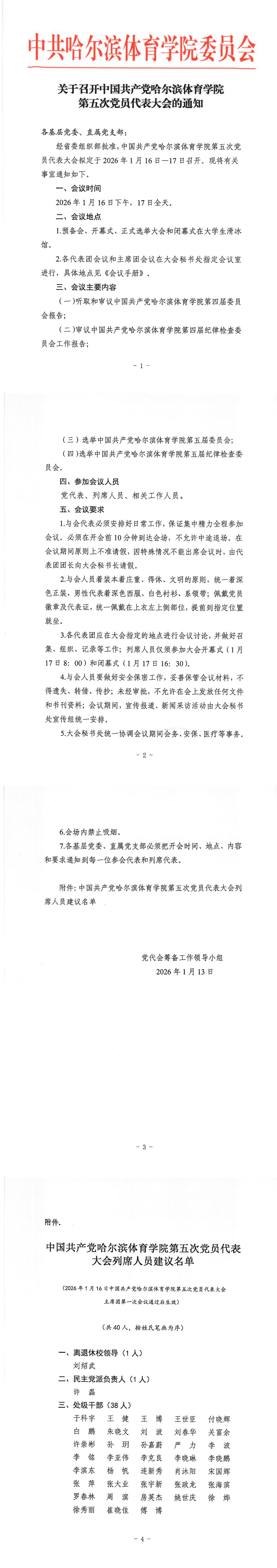 关于召开中国共产党哈尔滨体育学院第五次党员代表大会的通知